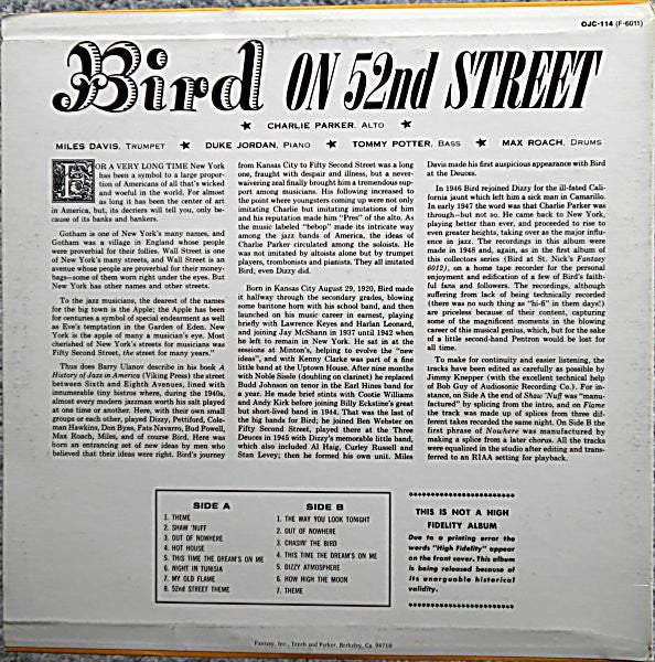 Charlie Parker - Bird On 52nd Street (Vinyl, LP, Album, Reissue) Very Good Plus (VG+) / Very Good Plus (VG+)