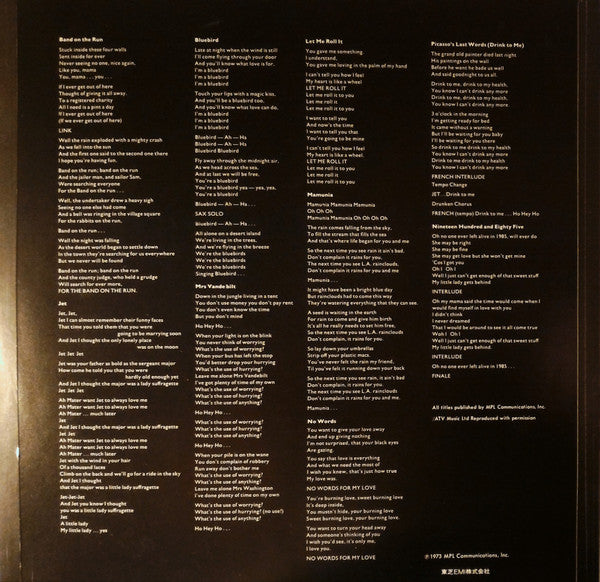 With obi, printed inner sleeve, 8-page insert featuring images with English & Japanese lyrics, and foldout poster.Capitol and MPL logos at the bottom of obi, top-left corner of front cover, and labels.