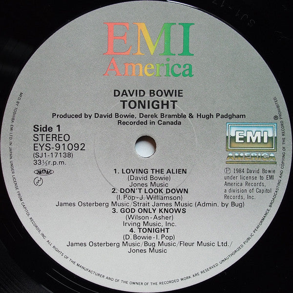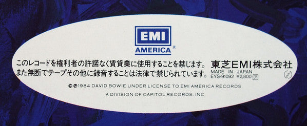 1st pressing with obi mentioning poster.℗ 1984 David Bowie under license to EMI America Records, a division Of Capitol Records Inc.