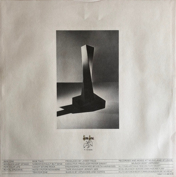 Band name and album title embossed on front sleeve, Swan Song logo embossed on back sleeve.