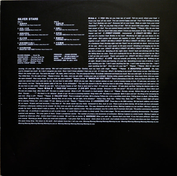 Recorded June to July, 1979. Not a lot known about this band, although they were apparently roadies for the group Bow Wow (later Vow Wow). Release comes with insert that includes lyric sheet and band review in (as I have been told very badly written) Chinese. The song titles on the insert are in both chinese and english although the chinese translations turn out to be more misogynistic versions of the titles. Weird considering they were a Japanese band, but then again judging by the cover art this seems to go well with their theme.Kyoji Yamamoto, the guitar player for the Japanese Rock group Bow Wow, was also the leader of the Silver Stars