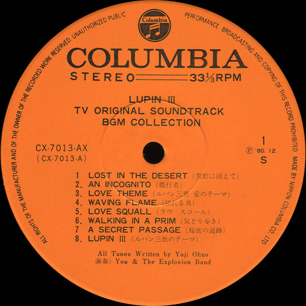 You & The Explosion Band - Lupin The 3rd - TV Original Soundtrack BGM Collection = ルパン三世 BGM集 TVオリジナル・サウンドトラック (Vinyl, LP) Very Good (VG) / Very Good Plus (VG+)