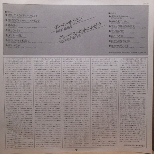 Japanese gatefold cover with obi & picture/lyric/liner note insert.Typo starts text at bottom of back cover: "©1777 Paul Simon / ℗ 1973, 1974, 1975, 1977 Paul Simon / Manufactured by CBS/SONY Inc. (Tokyo Japan)..."