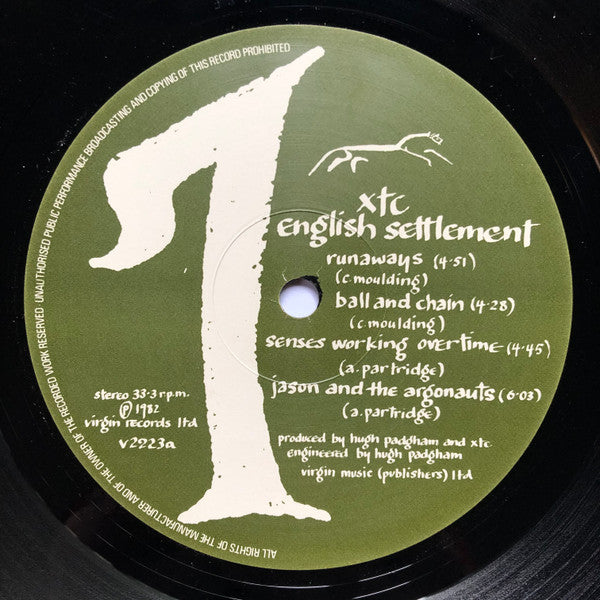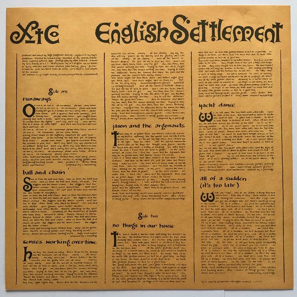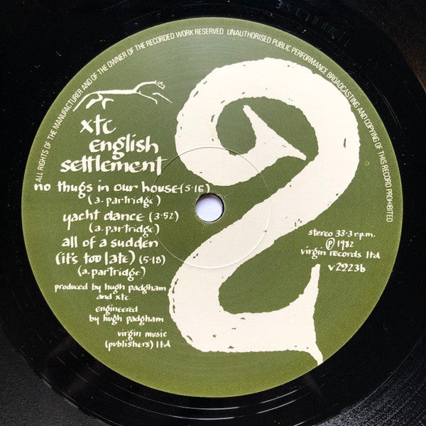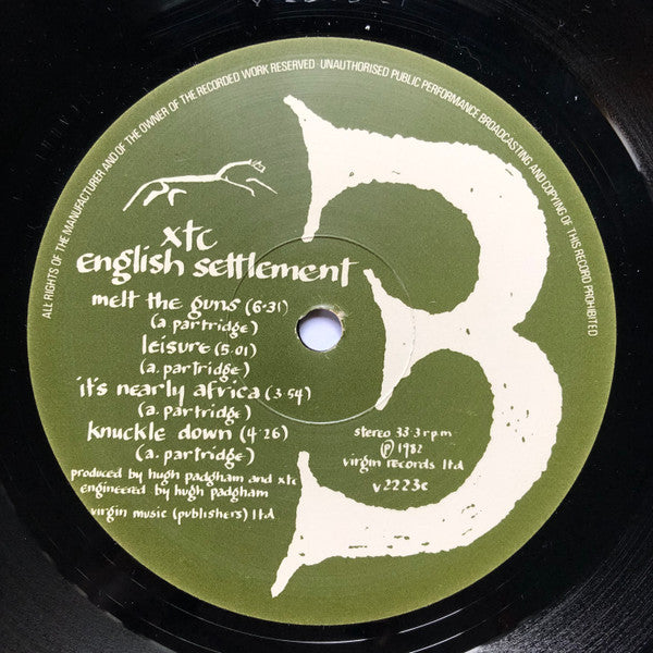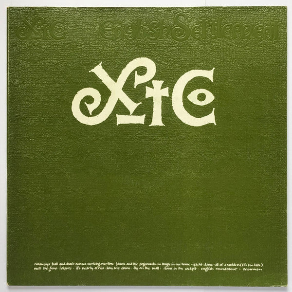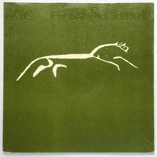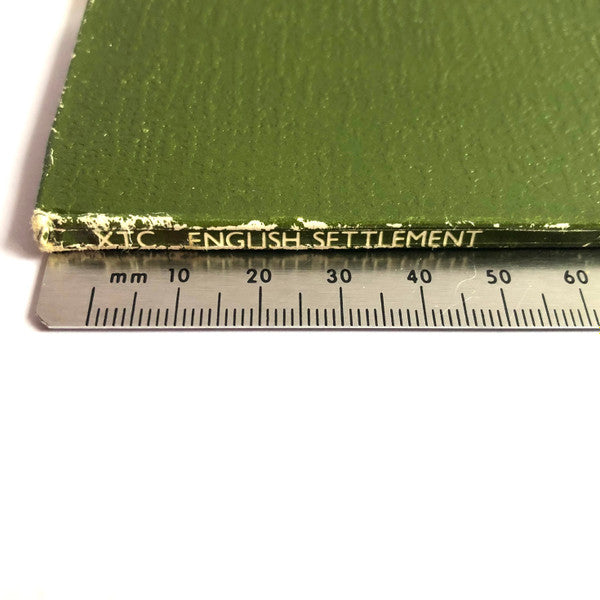 First issue, earliest narrow spine version, with the following attributes:Textured, single-pocket sleeve with 'XTC ENGLISH SETTLEMENT' embossed in the green area on front and back;